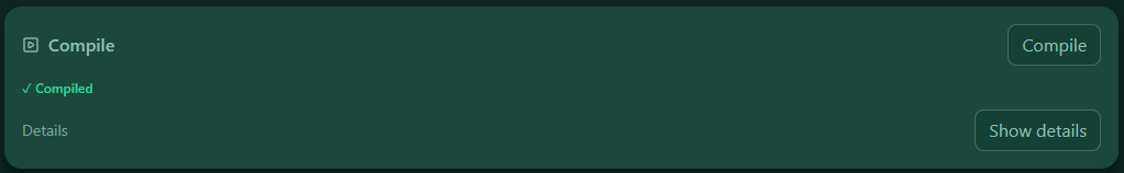 Open the Compile panel and click Compile. During compilation you’ll see Compiling…. After success, the compact status indicator shows ✓ Compiled.
