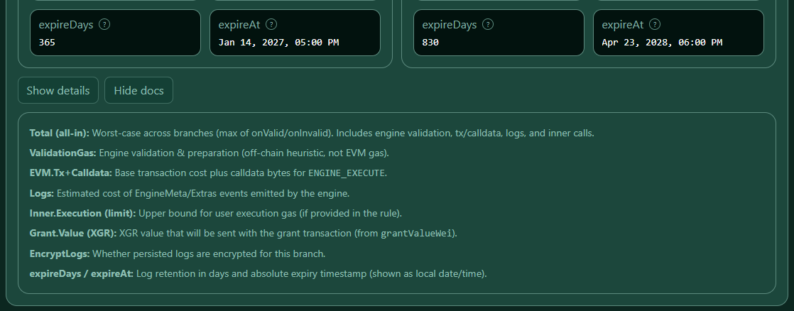 The Gas Estimate panel queries the XGR node to calculate an estimated gas breakdown for your current rule model. It provides: - a Total (all-in) worst-case estimate across branches, - a per-branch breakdown (onValid / onInvalid), - details for validation overhead, EVM transaction & calldata, engine logs, and inner calls, - JSON export for audits and reviews.
