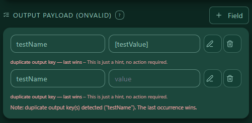 [suggestion, a yellow info line appears for 10s (no action required). - Duplicated keys show a note (“last wins”).