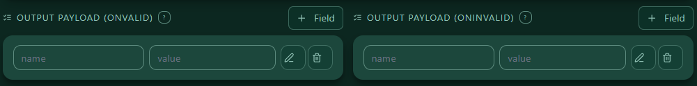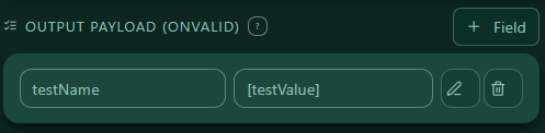 — The Output Payload panel with rows and a “+ Field” button for onValid/onInvalid.