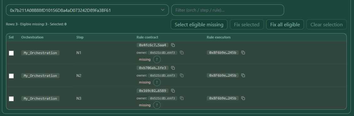 - Click Fix selected (or Fix all eligible) to batch-add the executor to those rule contracts.